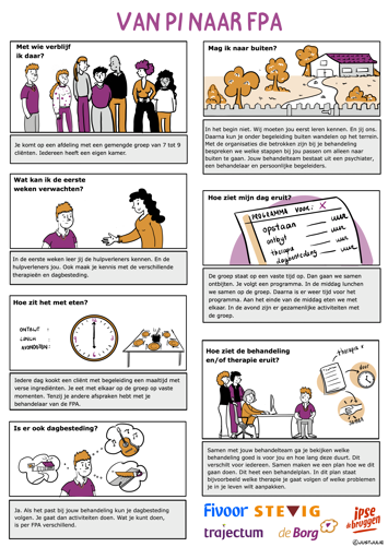Door het bekijken en bespreken van de animatie en de illustratie nemen we de cliënt mee in wat een FPA is, wat de cliënt hier gaat doen, wat hij/zij kan verwachten en waarom hij/zij daar behandeld wordt.