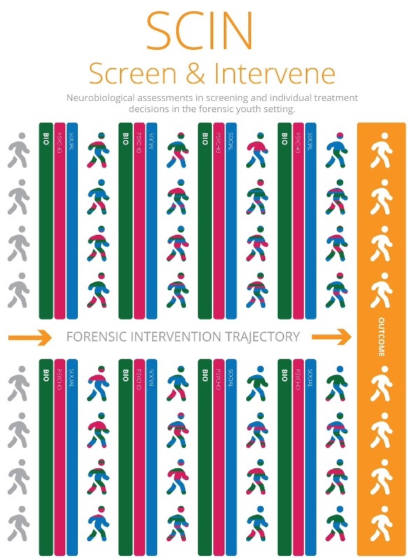 In het SCIN-onderzoek worden neurofysiologische, neuro-endocrinologische en neurocognitieve metingen gecombineerd met standaard psychosociale metingen in de klinische praktijk van forensische instellingen. De resulterende gegevens over neurobiologische veranderingen tijdens interventies zullen de basis vormen voor de ontwikkeling van een uitgebreid bio psychosociaal model voor het voorspellen van behandelresultaten. Op basis van het nieuwe model zal een klinisch beslisinstrument worden ontwikkeld om interventies in de forensische praktijk beter af te stemmen op individuele behoeften en ontwikkelingsperspectieven, wat resulteert in een veiligere samenleving met gezondere volwassenen.