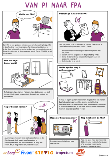 Door het bekijken en bespreken van de animatie en de illustratie nemen we de cliënt mee in wat een FPA is, wat de cliënt hier gaat doen, wat hij/zij kan verwachten en waarom hij/zij daar behandeld wordt.